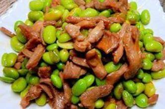 2、鍋裡加入油倒入肉絲快速炒至變色;然後加入毛豆,不停的翻炒;
