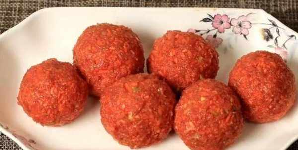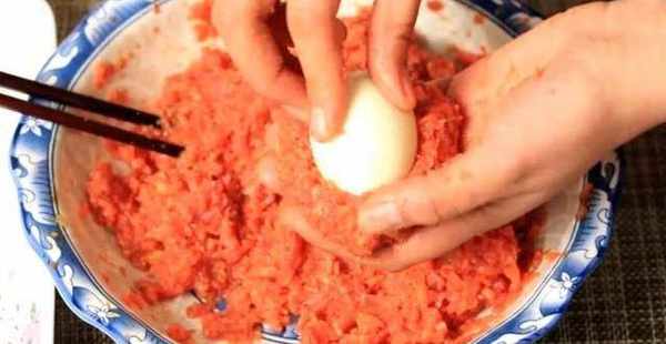 5.取適量肉餡用手團成球,再用手指戳一個洞放入剝殼的雞蛋,然後團成球。