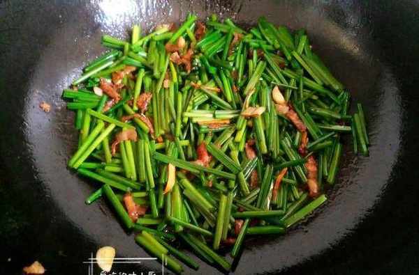食材:韭苔,五花肉,青椒,大蔥,蒜瓣,生薑,幹辣椒,食用油,花椒,鹽,味精,味極鮮,老抽。