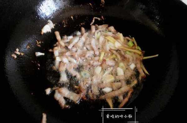2.鍋中放適量的食用油,把油燒至冒煙後先把切好的肉絲放入鍋中翻炒,把肉絲炒至變色後放入適量的花椒、蔥花、蒜片、薑絲提味。