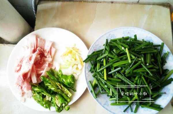 1.把韭苔的花骨頭掐掉,切成小段後放入水中洗凈,然後撈出瀝幹,五花肉洗凈切成肉絲,青椒洗凈切成片,再準備適量的蔥花、蒜片、薑絲。