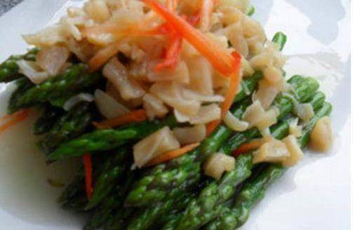 2、蘆筍去除老皮,洗凈,切成長段,放入加瞭鹽和油的開水中焯熟,裝盤備用。