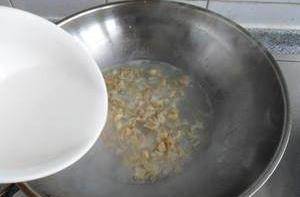 3、鍋中放入半碗清水,倒入泡軟的幹貝,用勺子慢慢把幹貝弄散,成為絲狀。