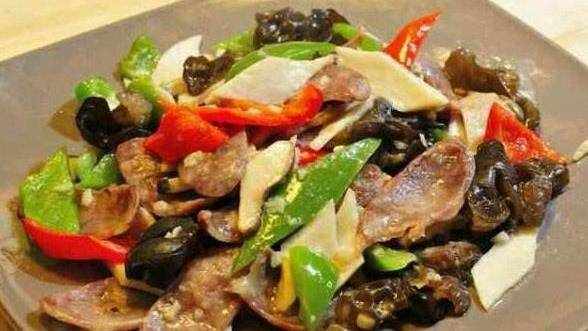 方法:1木耳水泡發洗凈,杏鮑菇切菱形塊,青椒切片,香腸切片。