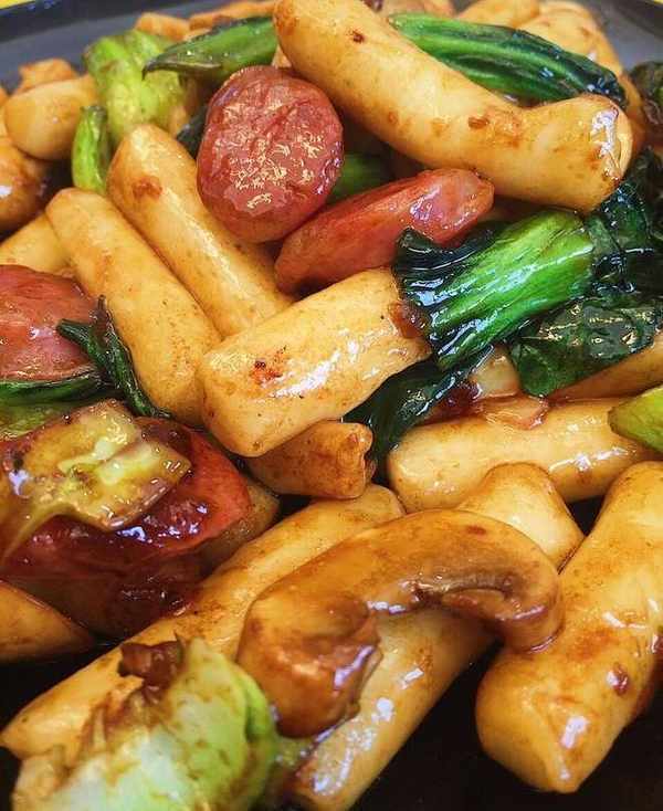 用料:年糕 青菜 臺灣香腸 蘑菇 生抽 老抽 糖