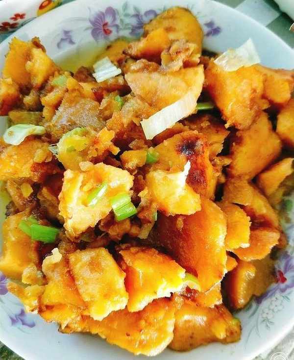 地瓜洗凈切塊 倒入鍋內翻炒 依次加入少許海鮮醬油少許雞粉少許白糖和食鹽 加水 待湯汁收盡加入蔥花 美味的小地瓜就出鍋啦~