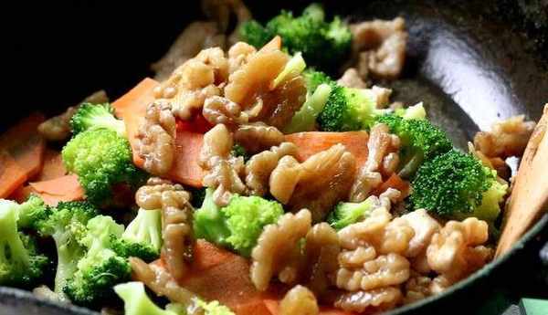 加入核桃仁、西蘭花和胡蘿卜片,大火翻炒至胡蘿卜斷生。