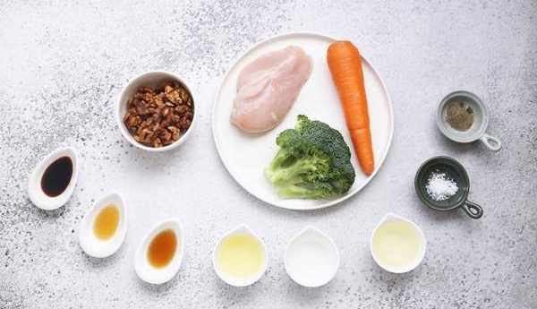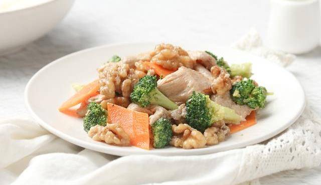 【核桃仁炒雞片】用料:雞胸肉250克核桃仁80克胡蘿卜30克西蘭花80克胡椒粉1/4茶匙鹽半茶匙蛋清30克水淀粉適量油適量料酒1湯匙香油1茶匙生抽1湯匙