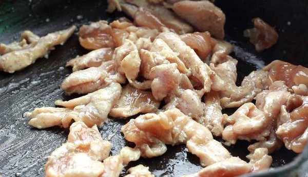 鍋中留底油燒熱,將雞肉片連同醃料一同放入鍋中滑炒,快炒至雞肉片變白。
