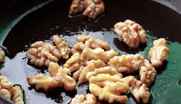 熱鍋冷油,放入處理好的核桃仁,翻炒出香味。炒好的核桃仁撈出瀝油。