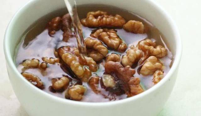 核桃仁用熱水浸泡五分鐘,用牙簽把核桃仁外層的皮剔掉。