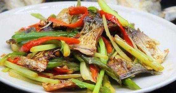 3、用煎魚幹的油鍋爆炒紅辣椒、青辣椒;加入香芹翻炒,放入煎好的魚塊;放鹽、醬油收汁,炒均即可。