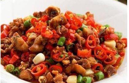2、鍋留底油,放蔥薑爆香,再放紅綠辣椒,翻炒均勻,加生抽、蠔油調色,將雞丁倒入鍋中快速翻炒幾下;放鹽、雞精調味,即可出鍋裝盤。
