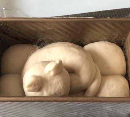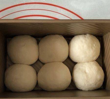 松弛好的面團,排氣收圓放入吐司盒