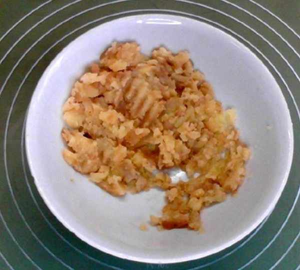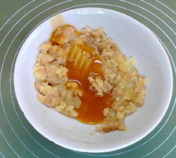 第3步、取100克土豆泥,加入鮮雞汁拌勻,