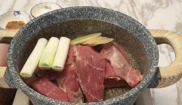 1.將牛肉(豬肉,雞肉)洗凈,冷水大盆泡2小時,中途換一次水,順著紋理切成牛肉塊(豬肉和雞肉直接大塊煮,不切小塊)