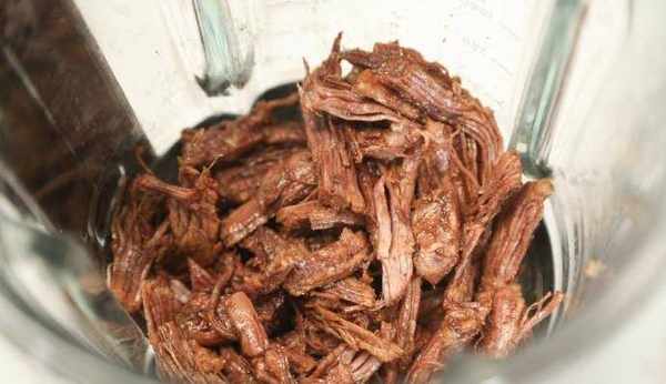 4.瀝幹水份,將煮好的牛肉/豬肉/雞肉 放入攪拌機、料理機、破壁機中打碎,如果這些機你都沒有,就用手撕碎它。