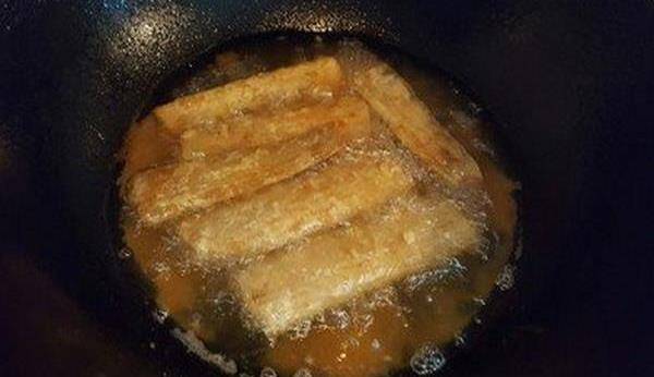 3、起鍋熱幹,倒入適量油,油熱後放入帶魚段,變成金黃色後撈出,裝盤即可。