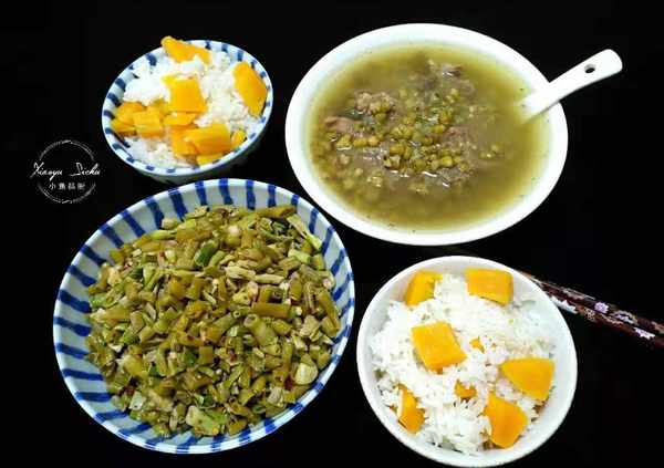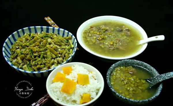 因為天氣太熱,媽媽坐的早班車,我去火車站接她,本想著回來瞭,我再出去買菜的,但是媽媽說外面太熱瞭,叫我別出去瞭,正好給我們帶瞭很多傢裡自己種的蔬菜和我最愛吃的小幹魚,不用買菜瞭。老公今天上白班,中午在單位吃飯,女兒也去補習班畫畫去瞭,所以午餐就我們娘倆吃飯,一進門,我和媽媽一邊聊天,一邊洗菜燉湯,不一會兒,午飯就做好瞭,燉瞭一鍋綠豆排骨湯,炒瞭一個下飯小菜,主食是雜糧飯,兩個人兩個菜,除瞭排骨是從冰箱裡拿出來的,其他食材都是媽媽自己種的,純天然,無污染的綠色蔬菜,吃著特別滿足。