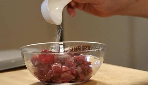 2.將羊肉洗凈後,切成5厘米長、2厘米厚的小丁;切好的羊肉放入1個蛋清,20克淀粉,5克鹽,味精5克,料酒5克,胡椒粉5克,老抽3克,醃制20分鐘。
