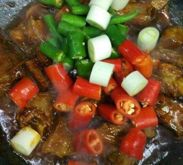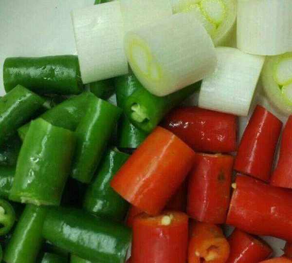 準備青紅杭椒段和蔥段適量
