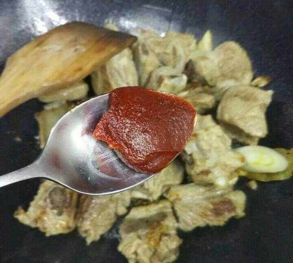 再把排骨下鍋,翻炒均勻,加入一小勺的排骨醬