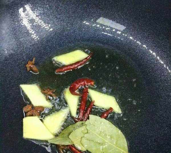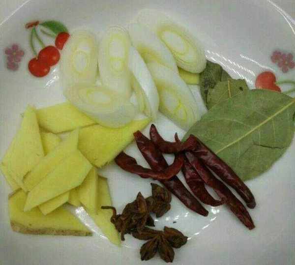 準備小料:蔥片、薑片、八角、香葉、紅椒(傢裡有什麼就準備什麼)
