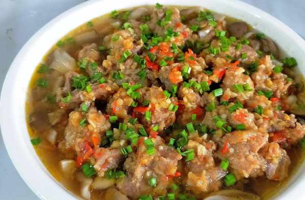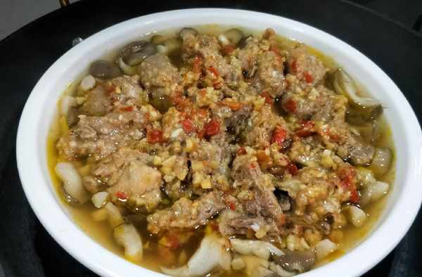蒸好的排骨取出放上蔥花點綴下。嘗一口,排骨嫩滑鮮香,菌菇吸足瞭排骨醬汁的香,味道特別好吃。老公專挑菌菇吃。脆脆嫩嫩的好下飯。