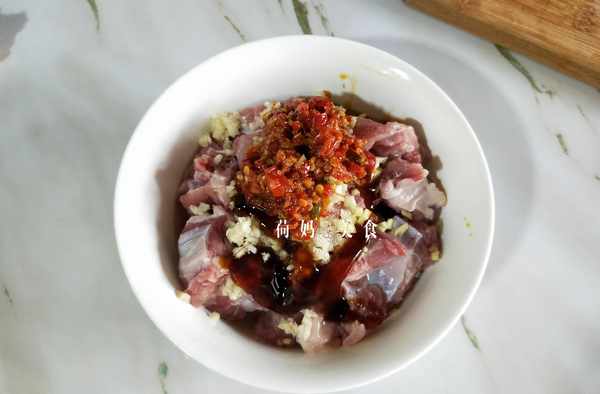 【菌菇剁椒蒸排骨】主要材料:中排,菌菇和自制辣椒醬。排骨剁小塊,放水中泡洗幹凈控水。放入碗中加一小勺鹽、少許胡椒粉、五香粉、1勺料酒、2勺剁椒醬,1勺薑蒜末,半勺蠔油,抓勻醃制10分鐘,再放入淀粉抓勻。