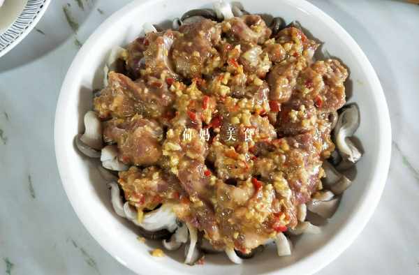 取一個大一點的深盤,放入菌菇墊底,再將醃好的排骨放上面,均勻鋪開