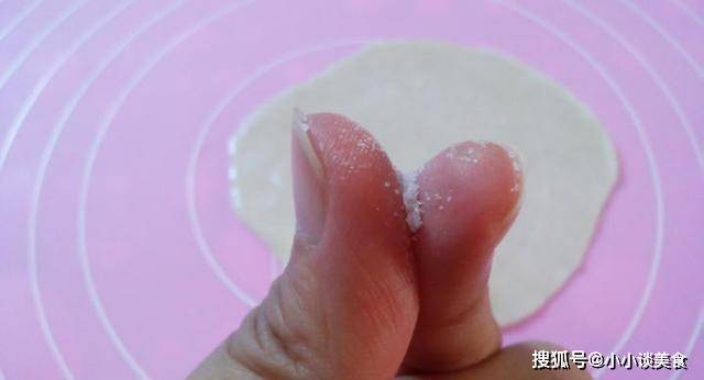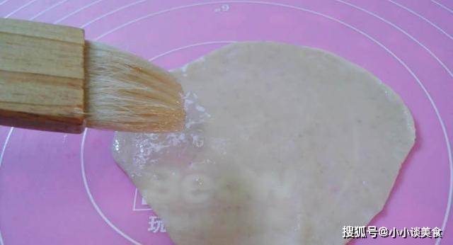 取一片餃子皮攤開,抹上一層油,不要太厚。