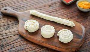 將面皮疊成多層的長條狀,卷好,盤成圓形,靜置10分鐘後壓平,搟成面餅,面餅完成!