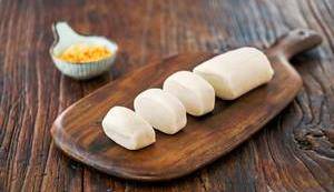 面團搓成長條狀後,分成125g左右的團子,用搟面杖搟成方形大薄片,正反面都刷上一層豬油。