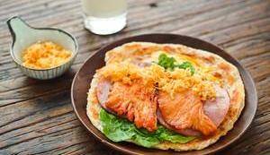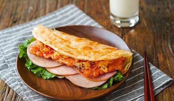裡脊肉和火腿煎熟,盛出備用。轉小火,打入一顆蛋,半熟後劃破蛋黃,蓋上面餅,待雞蛋全熟且完全貼合於面餅後盛出。依次鋪上生菜、火腿片、裡脊肉,撒上肉松。