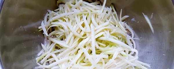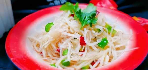 白蘿卜清洗幹凈之後,給他切成細絲,切的越細越好,然後放在盆中,再切上點青紅尖椒絲,用來點綴搭配顏色,