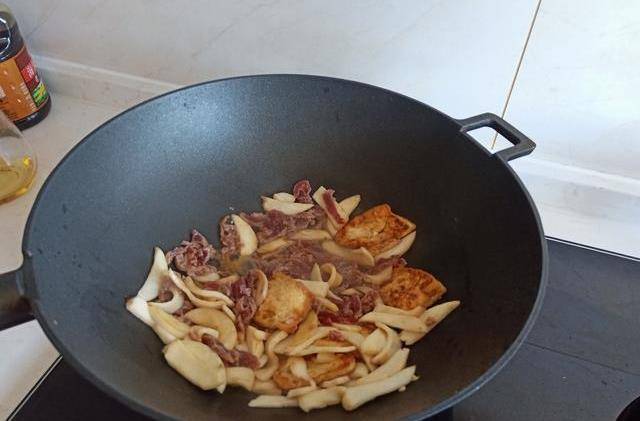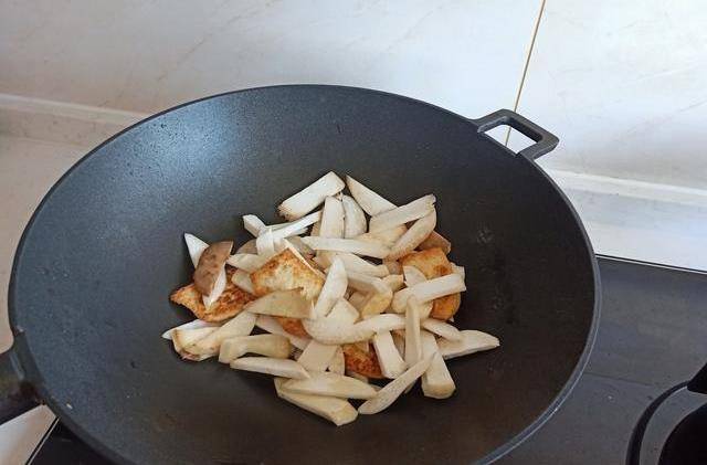 豆腐不用起鍋,直接加入杏鮑菇翻炒。