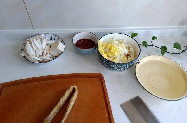 首先是食材準備,杏鮑菇切片,豆腐半塊下鍋前切厚片,肉絲加鹽、料酒和醬油醃制,娃娃菜切小塊,平菇切小朵,皮卷切段。