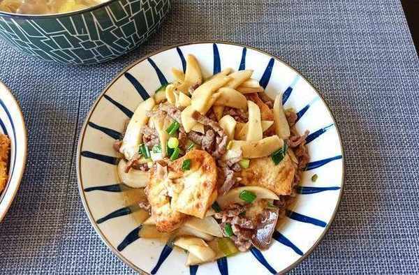 豆腐煎至兩面金黃,與杏鮑菇和肉絲一起翻炒,營養豐富,味道鮮美,是我傢百吃不厭的一道傢常小菜。