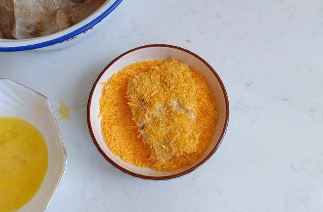 準備三個小碟子,分別放入玉米淀粉、蛋液、面包糠。