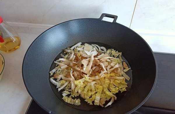 同時,左邊炒鍋內加適量水,加入娃娃菜和平菇煮湯。