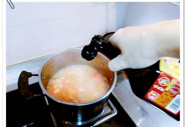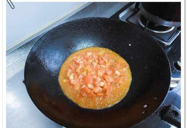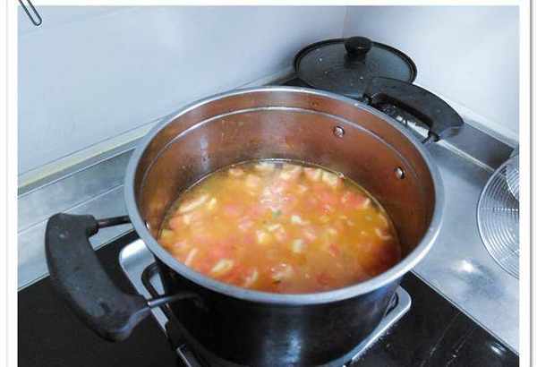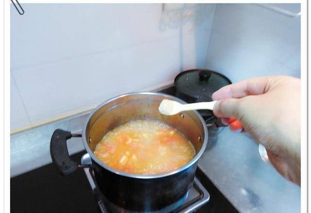 將炒好西紅柿汁加入涼水鍋,燒開。