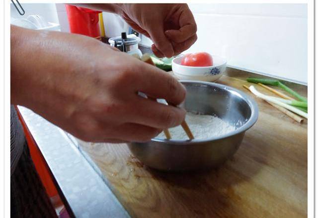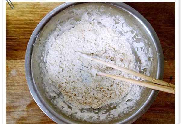 取盆,加入適量面粉,一手如上圖蘸點水彈水,一手用筷子攪拌,直至攪成絮狀即可。