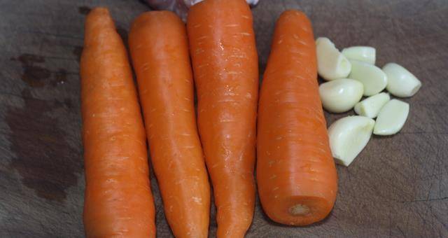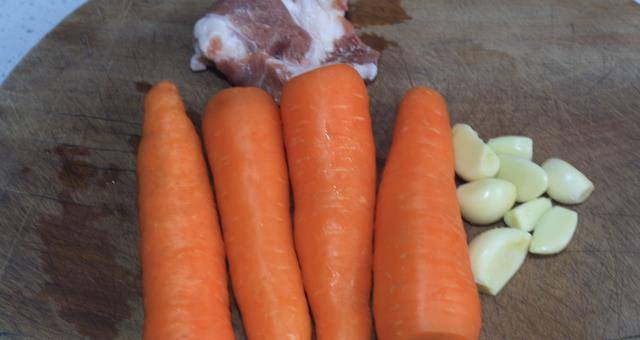 步驟一:準備好所需的胡蘿卜4個,蒜粒7-8個,豬肉3兩。