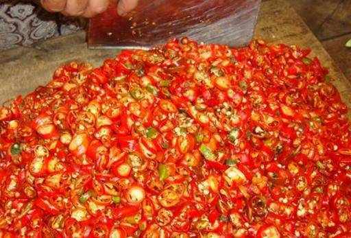 純手工剁碎辣椒,很多人也要機器打碎,手工的明顯口感更好。切辣椒一定要帶手套不然會狠辣手