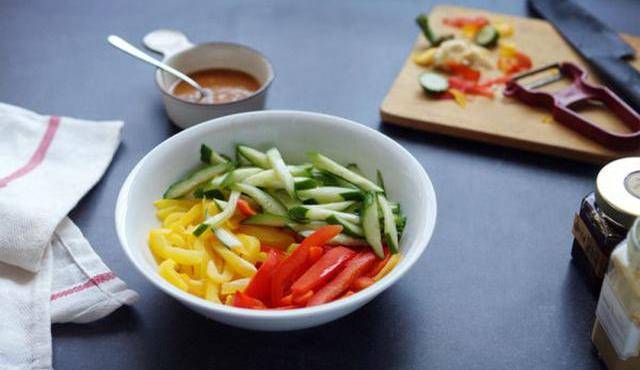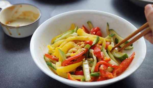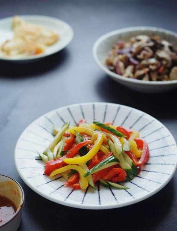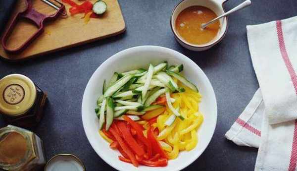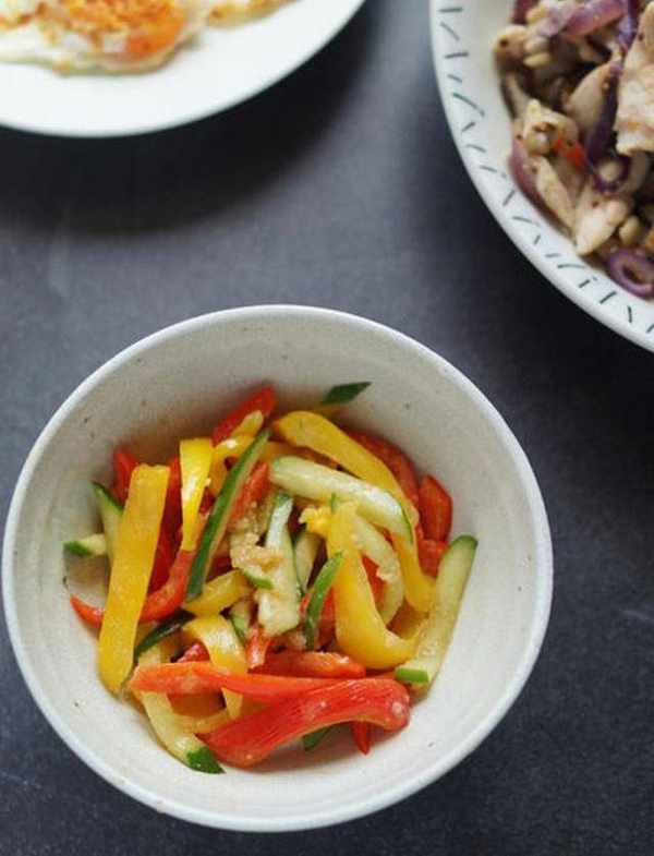 很快手的先切瞭半顆甜椒,隨手塞一塊進嘴裡……齁!!有點無法忍受粗粗的皮,還是拿出專用刨刀刨掉甜椒皮,連已經切成細條狀的也不放過,小心翼翼的慢慢刨,心裡猶豫著等一下到底要直接涼拌?還是先煮軟?本來想快速完工卻越弄越慢,一道菜到底要後悔幾次XD,考慮瞭幾秒還是送進微波爐當3分鐘,小黃瓜則用少少的鹽巴抓醃殺青,順便去除多餘水份