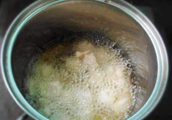 (6)鍋中到油,6成熱放入裹好的肉炸一下小火,撈出備用;