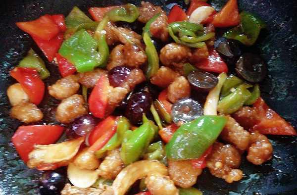 (8)鍋中炸瞭肉的有留點炒薑蒜蔥青紅椒;