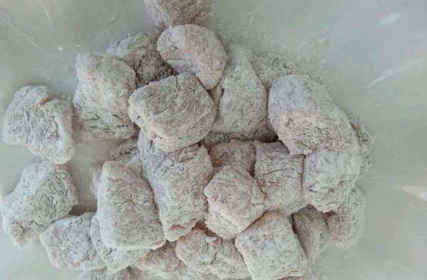 (4)然後把肉在放入幹的豆粉裡裹一層;