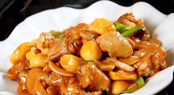 3、平底鍋倒入少許油,先倒入雞肉,炒至變色,加入栗子,繼續炒幾分鐘;