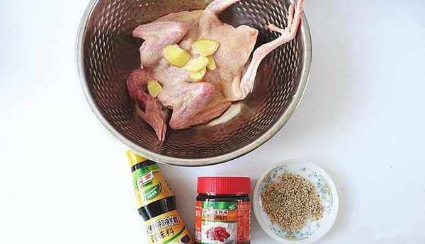 主材料:鴿子1隻,薑片10克,油1匙,白芝麻1小匙